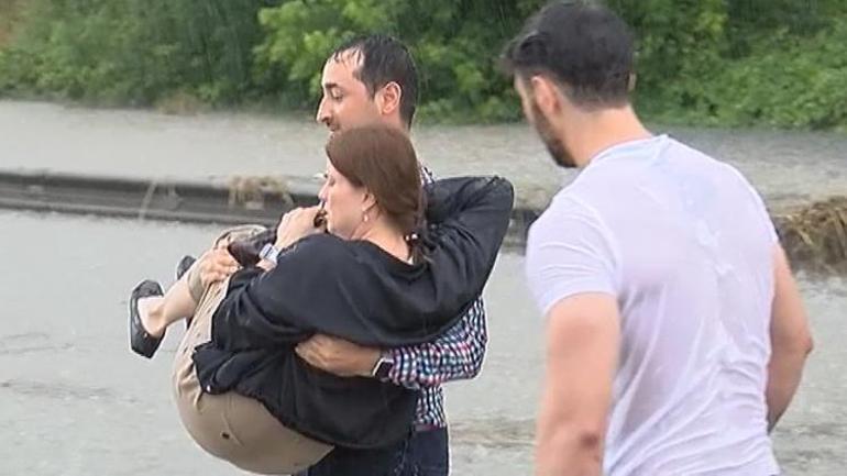 Aynı su birikintisinde kalan bir sürücü ise araçtaki eşini kucaklayarak göle dönen yoldan çıkarttı.