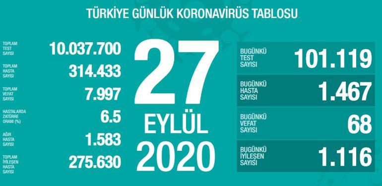 Son dakika haberi... Sağlık Bakanlığı, 27 Eylül Türkiye Günlük Korona Tablosu'nu paylaştı. Tabloya göre, son 24 saatte 101 bin 119 Kovid-19 testi yapıldı, 1467 kişiye hastalık tanısı konuldu, 68 kişi Kovid-19 nedeniyle hayatını kaybetti, ağır hasta sayısı 1583 oldu.